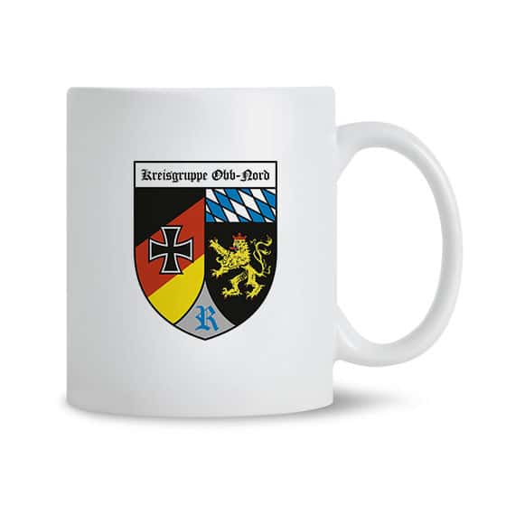 weiße Keramiktasse mit Signet „11. MdV 2023“ und „Wappen der Kreisgruppe Oberbayern-Nord“