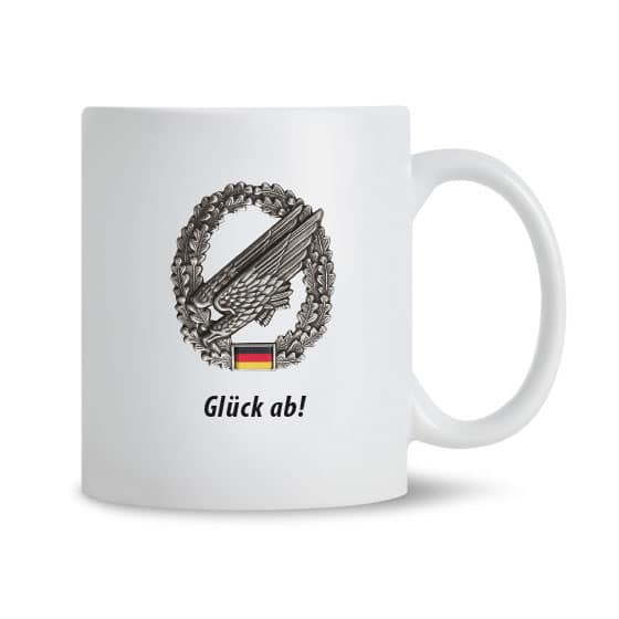 weiße Keramiktasse mit Signet „Traditionsverband Luftlandefernmelder“